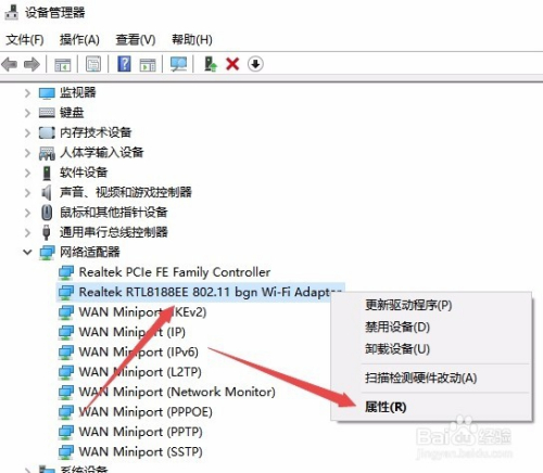 在展开的网络适配器窗口中,找到无线网卡的驱动,然后右键点击该驱动,在弹出菜单中选择“属性”菜单项。